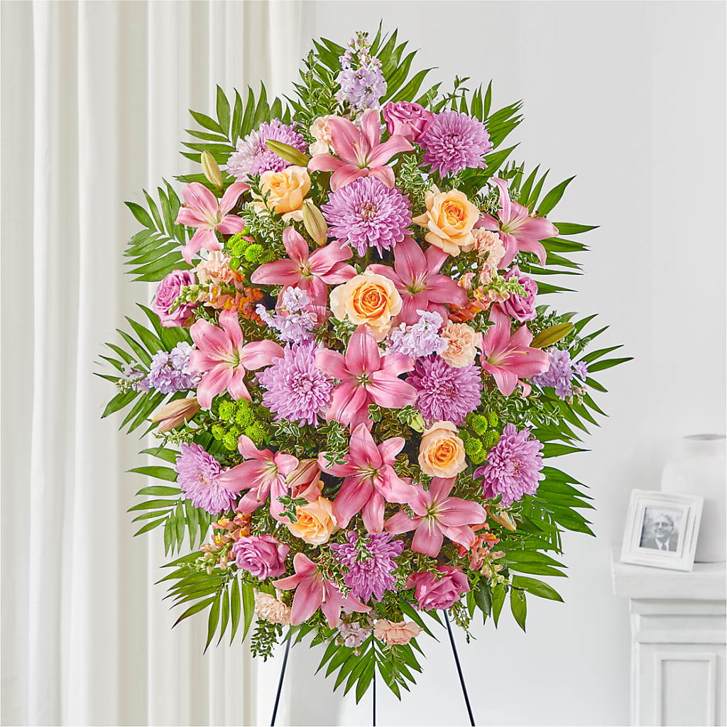 Spread love and light in times of hardship with this standing spray of mums, carnations, lilies and more.